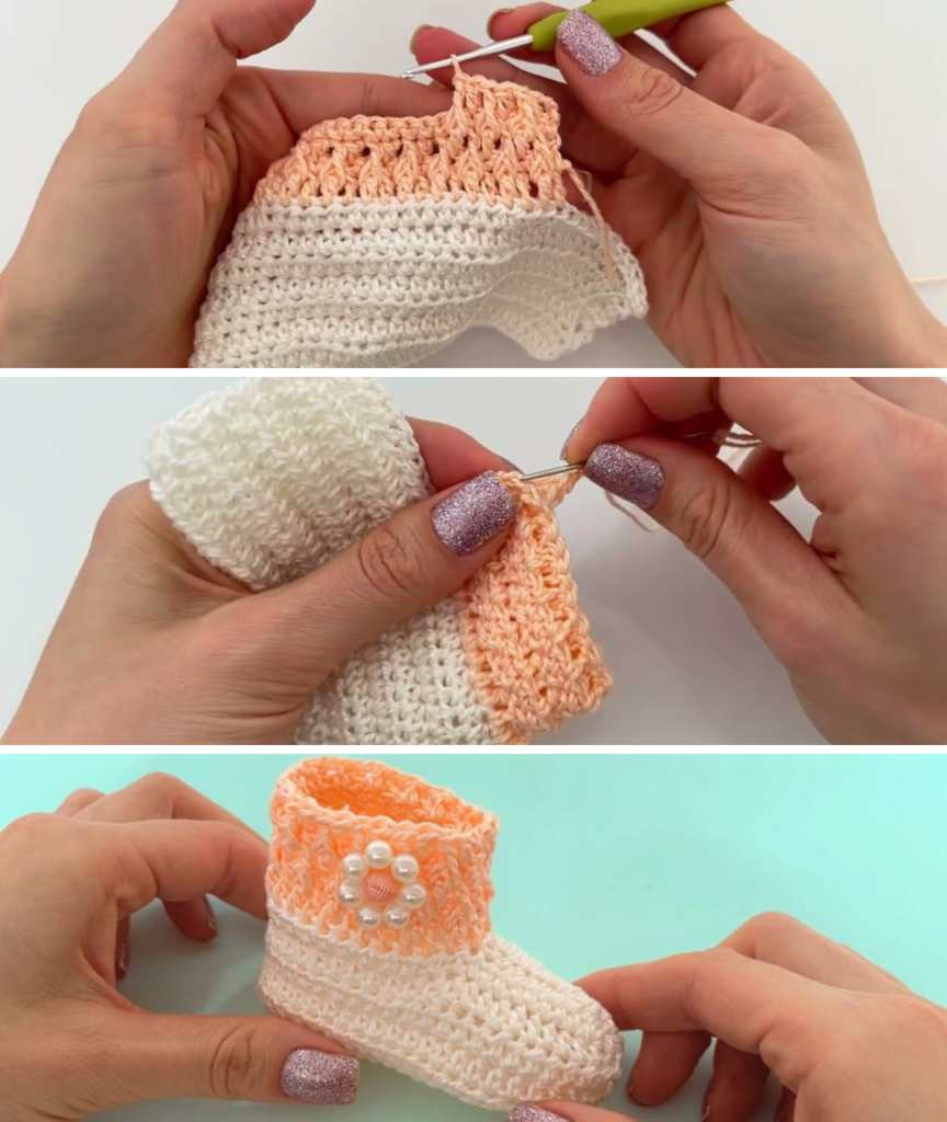 - Decoration: For a girl’s bootie, consider sewing small crochet flowers or a simple bow made of silk ribbon to the front ankle area.