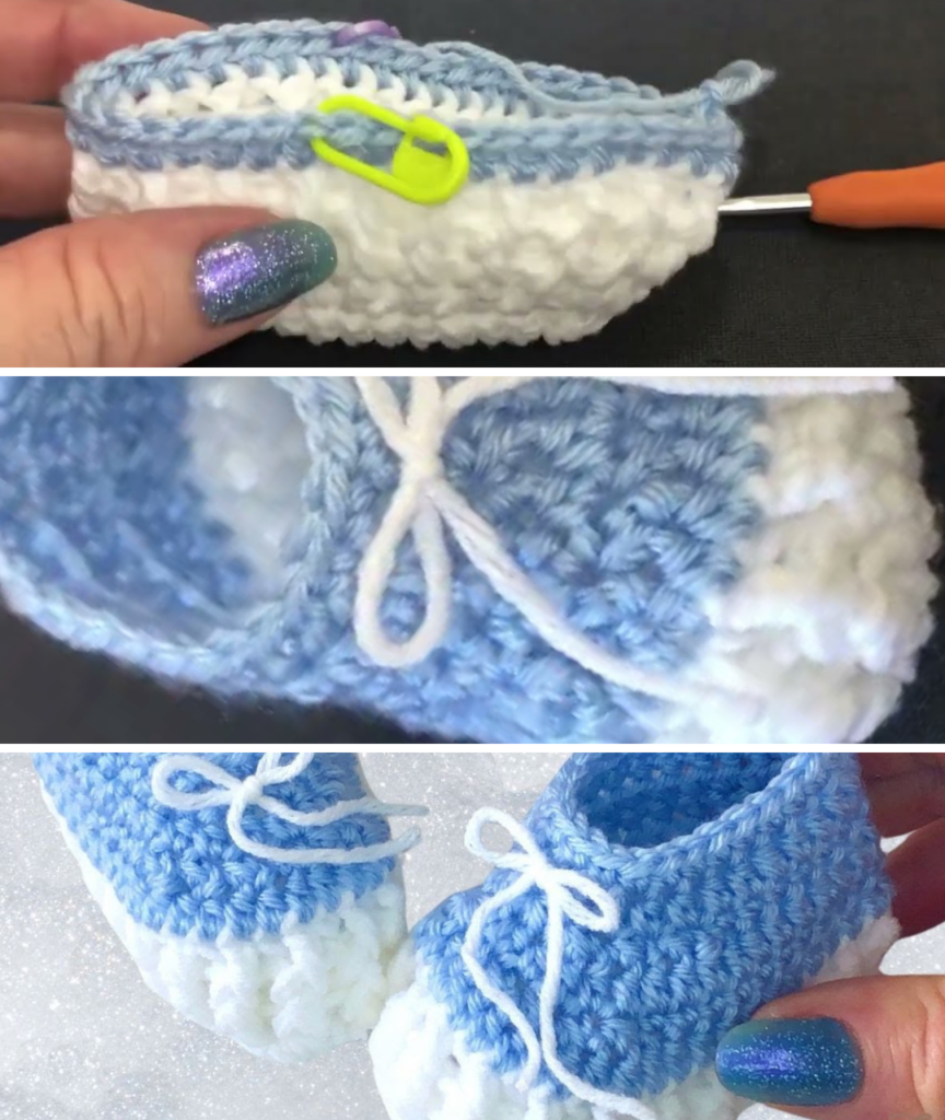 2. Add Decoration: You can create a simple decorative cord by chaining about 40 stitches and weaving it through the spaces in Row 8 (the final HDC row). Tie the ends in a simple bow over the foot, or sew a small fabric bow on top.